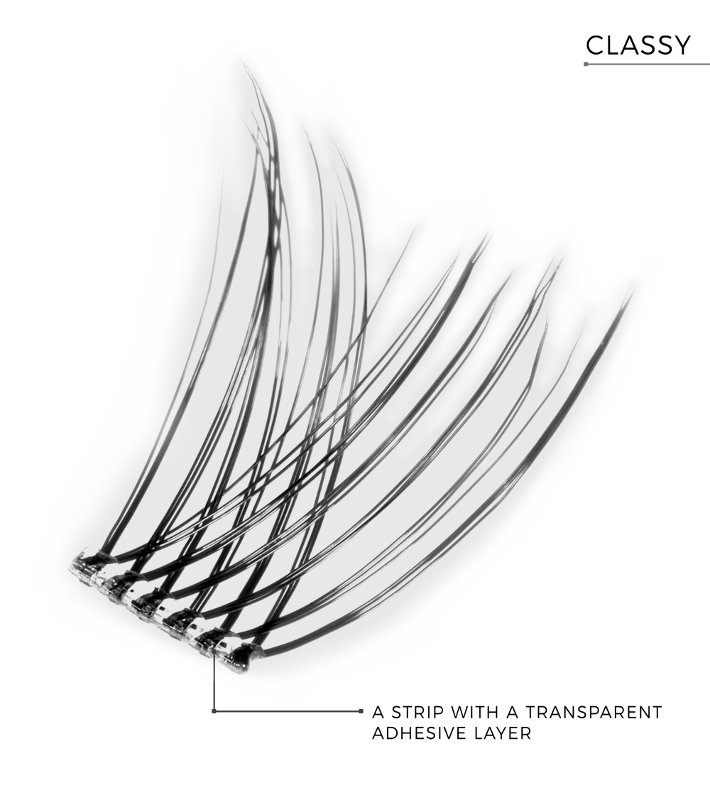 The pre-glued Classy lashes are the go-to choice for women who appreciate subtlety and elegance. Their lightweight design blends perfectly with any look, providing a natural effect of longer lashes. Thanks to easy application and durability, the gaze gains a charming look, and the makeup always looks perfect. Perfect for any occasion.