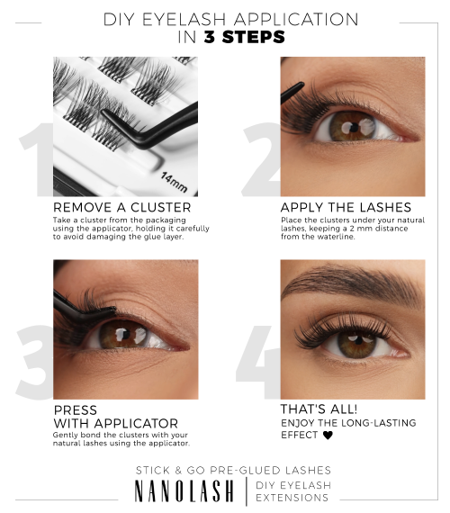 The DIY pre-glued lashes from Nanolash ensure the highest quality. Their resilient, deformation-resistant structure provides a perfect look that lasts up to 5 days. The cluster lashes are set on flexible bands coated with transparent glue, which makes the application quick and easy. The case contains 36 cluster lashes in three lengths: 10, 12 and 14 mm. Depending on the eye shape and size, they are enough for 4-6 applications. In addition, each case comes with an applicator for proper application of the pre-glued lashes.
